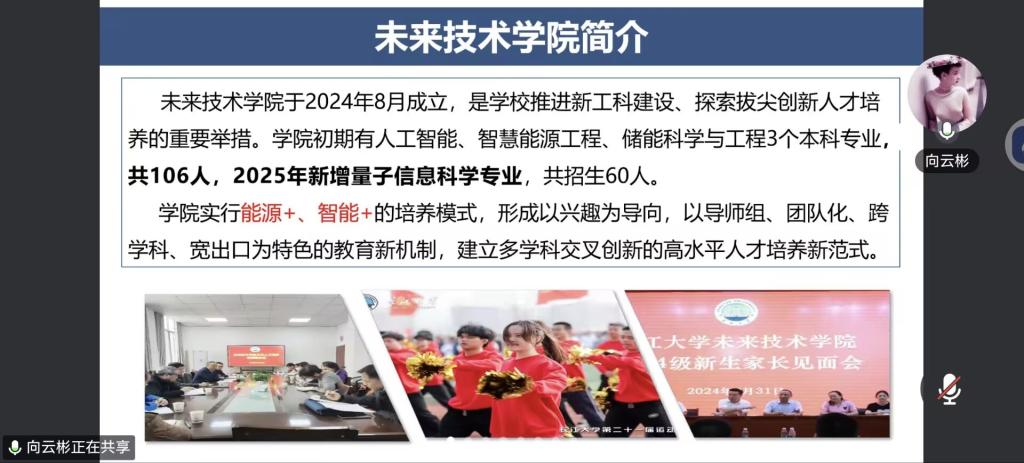 副院长邓福成从智慧能源工程专业校区调整,导师配备、国际交流等进行了说明。学院将依托“双一流”学科团队,实行导师组、团队化指导。为拓宽学生国际视野,学院开展牛津、剑桥、新加坡国立等世界著名学府游学计划,今年暑期学院选派1名学生到剑桥游学为期3周。
